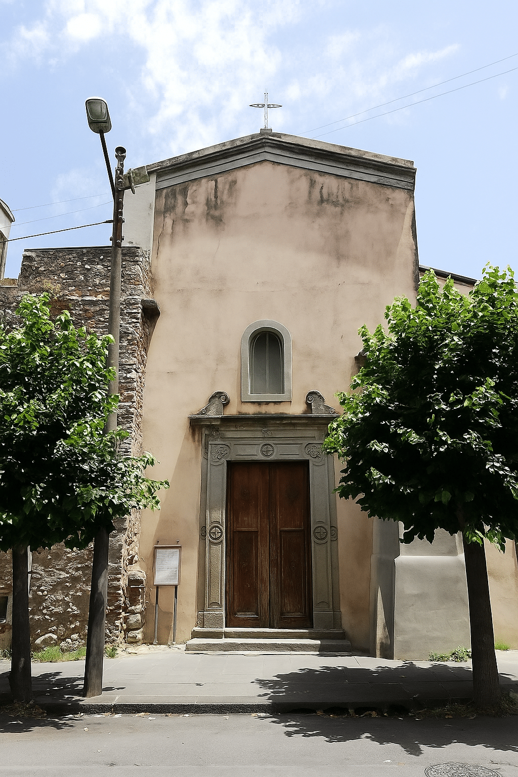 Il prospetto principale era in origine arricchito da una torre campanaria, demolita all'incirca tra il 1955 e il 1956 per realizzare l'odierna strada.